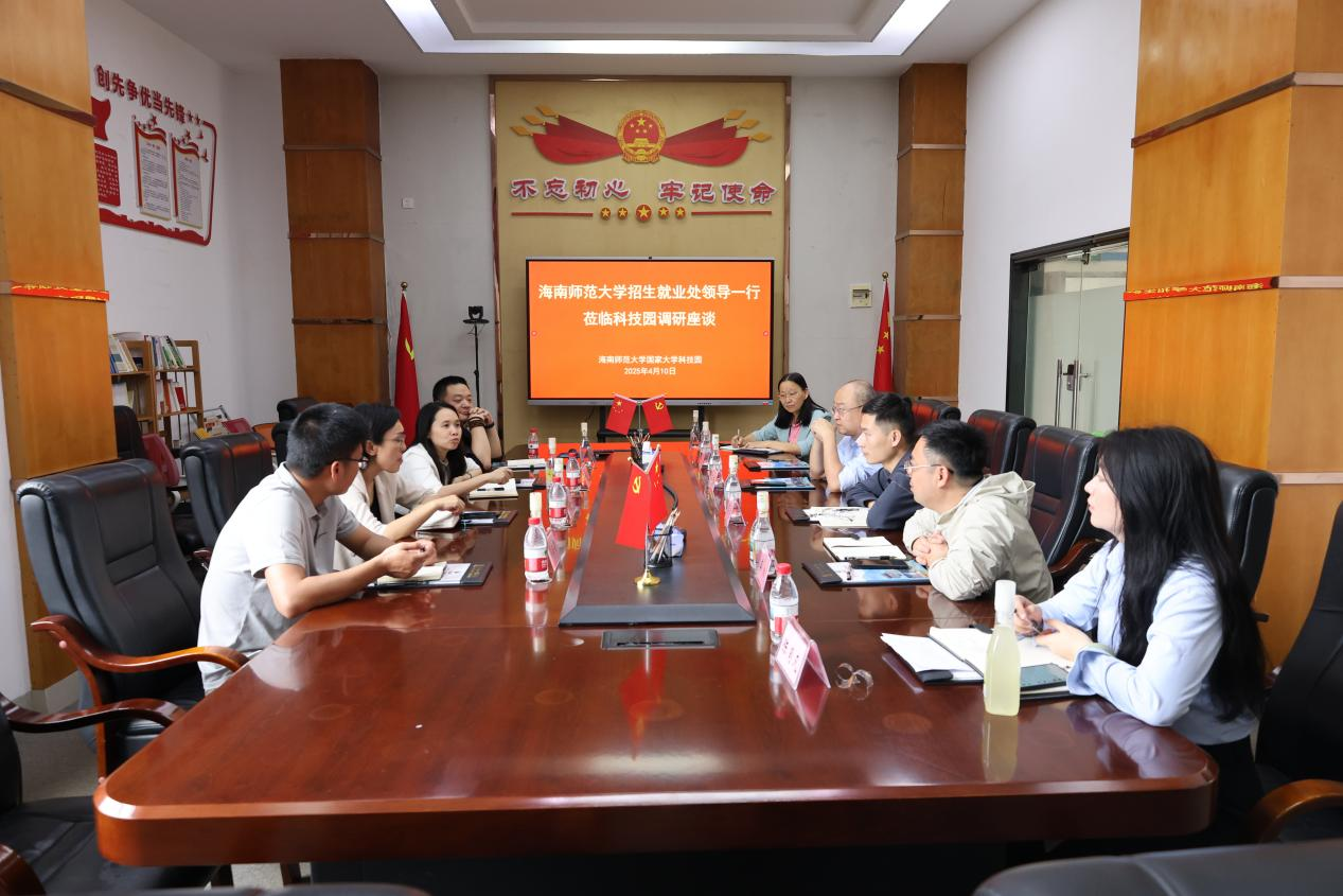 2025年4月10日,海南师范大学招生就业处副处长符星一行到科技园调研座谈,科技园总经理崔楠,班子成员、总经理助理龚琨及相关部门负责人接待。双方围绕职业技能培训、校企协同育人、创新创业服务等核心内容展开深度交流,共商人才培养与就业服务优化路径。