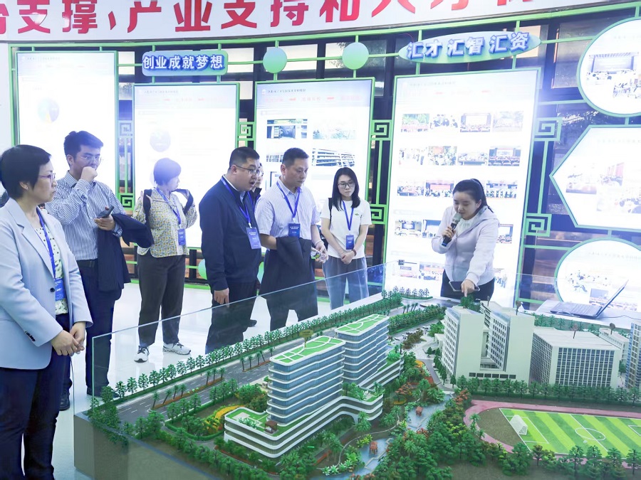 代表团深入科技园核心区域,依次参观了科技园展厅、科技成果展示与交易厅、文化创意厅、“未来已来”科普馆以及海南省激光技术与光电功能材料重点实验室,全面感受了科技园在推动科技成果转化、促进学科交叉融合以及培养创新人才方面的扎实举措与生动实践。在科技园展厅,代表团听取了关于科技园发展历程、功能定位、服务体系及孵化成效的整体介绍,对科技园推动产学研用协同创新的平台建设有了初步认识。在科技成果展示与交易厅,一系列源自科研团队的创新产品与技术模型吸引了代表团的关注。在文化创意厅,科技与人文艺术的交融令人眼前一亮。这里不仅展示了富有海南地域特色的文化创意产品,也呈现了如何利用现代科技手段对传统文化进行创新性开发和传播,引发了代表团关于教育与文化传承创新话题的探讨。在“未来已来”科普馆,代表团通过VR互动、AI体育项目等沉浸式体验,切身感受到前沿技术对未来教育与生活方式的深刻影响。在海南省激光技术与光电功能材料重点实验室,代表团近距离观摩了先进的科研设施与实验环境,并听取了研究团队在激光技术、半导体材料等领域的进展汇报。
