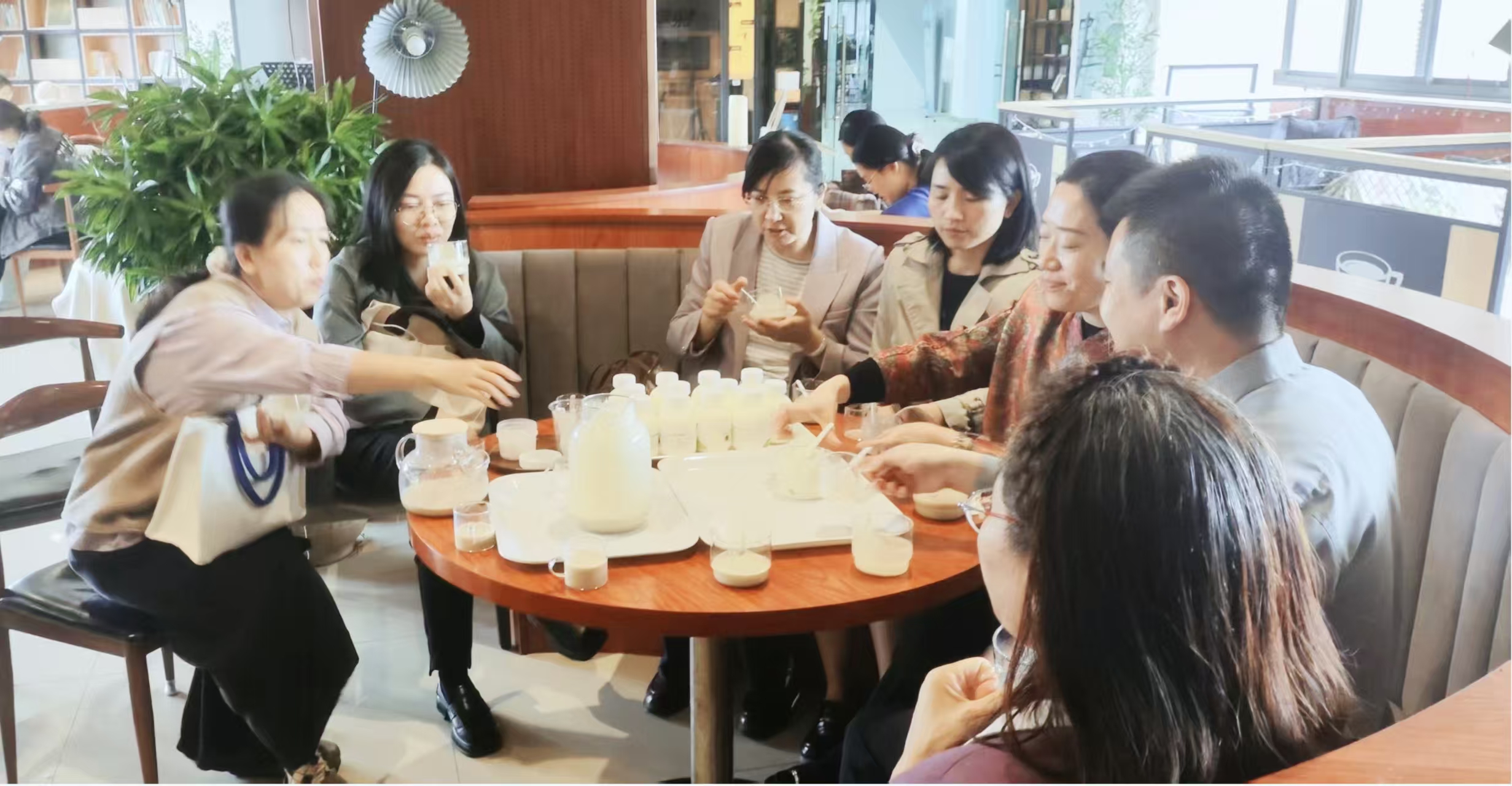 来宾们现场体验了科技园专精特企业生产的蜂蜜盖产品、食品科技团队研发的植物基酸奶产品和诺丽果饮料等大健康食品,并与科技园概念验证中心负责人曾驰教授进行了交流。苏静教授敏锐地意识到了蜂蜜盖可以成为一个成果转化的载体,可以把海南卫生健康职业学院中医药专业的很多成果植入其中,开发成大健康饮品,并且表示愿意发挥医科院校学科优势,帮助科技园对诺丽果产品做功效验证;来宾们品鉴了用文昌椰子制成的植物基酸奶不仅规避了中国人常见的乳糖不耐受的健康问题,而且口感惊艳、令人赞不绝口。科技园与园区企业共建的中试平台不仅具有生产能力,更具有食品生产许可证和食品经营许可证等资质,并且在大学城拥有上百台自动售货机便于做新品试销,甚至还可以为师生团队提供创新创业项目经费资助。作为海口唯一的国家级大学科技园、海南省唯一的国家级创新创业教育实践基地,海师大科技园正在用全要素赋能创新创业的服务体系努力降低科研成果转化门槛、提高创新创业项目成功率。
